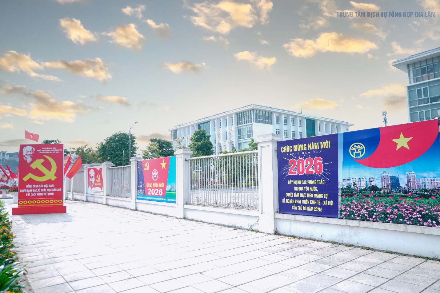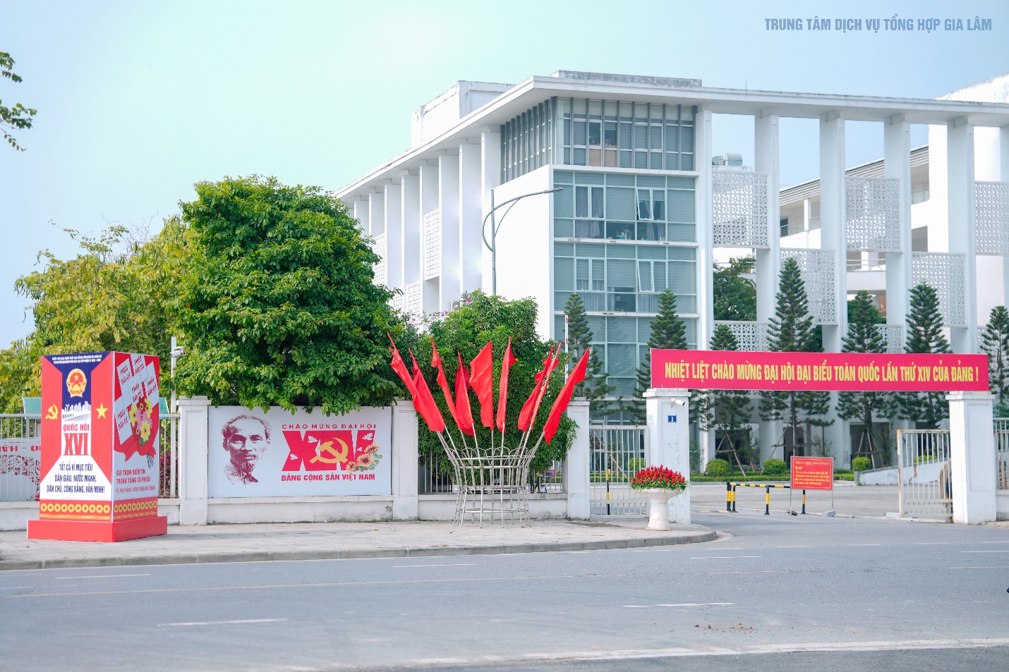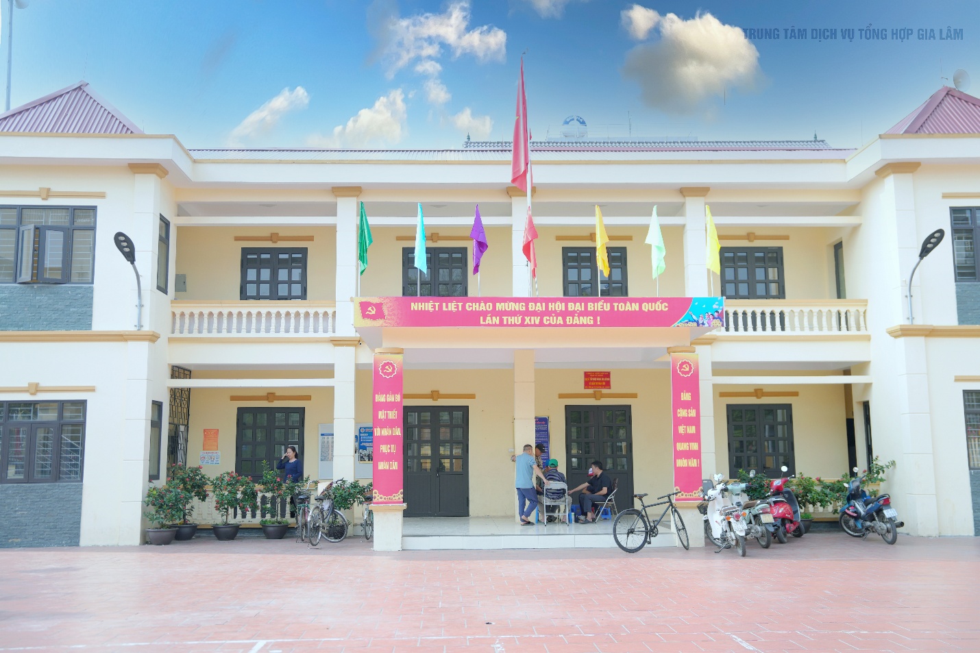 Không khí rực rỡ cờ hoa, pano khẩu hiệu tại trụ sở Đảng ủy-HĐND-UBND xã Gia Lâm chào mừng Đại hội đại biểu toàn quốc lần thứ XIV của Đảng.