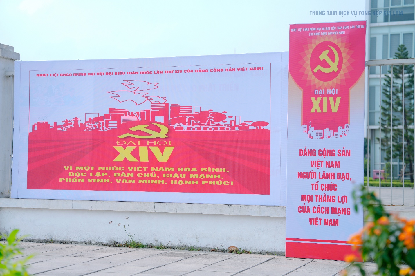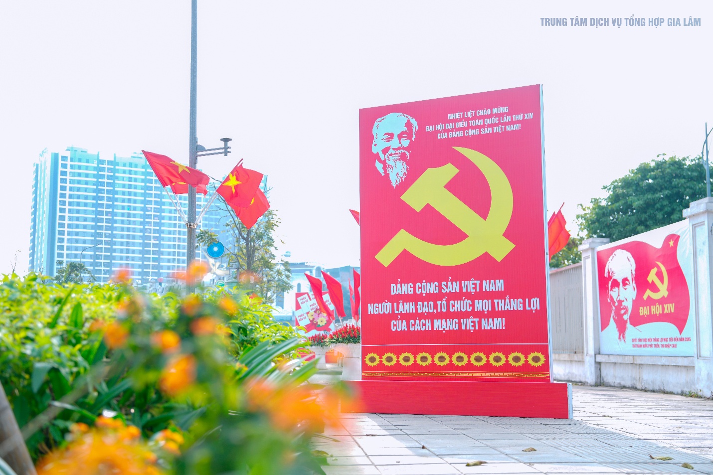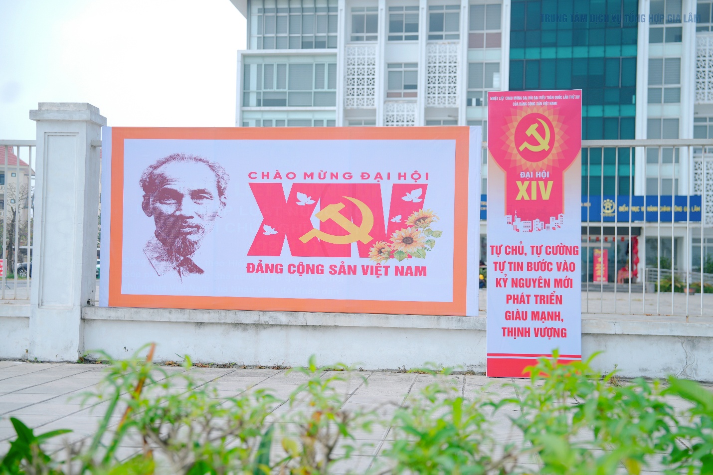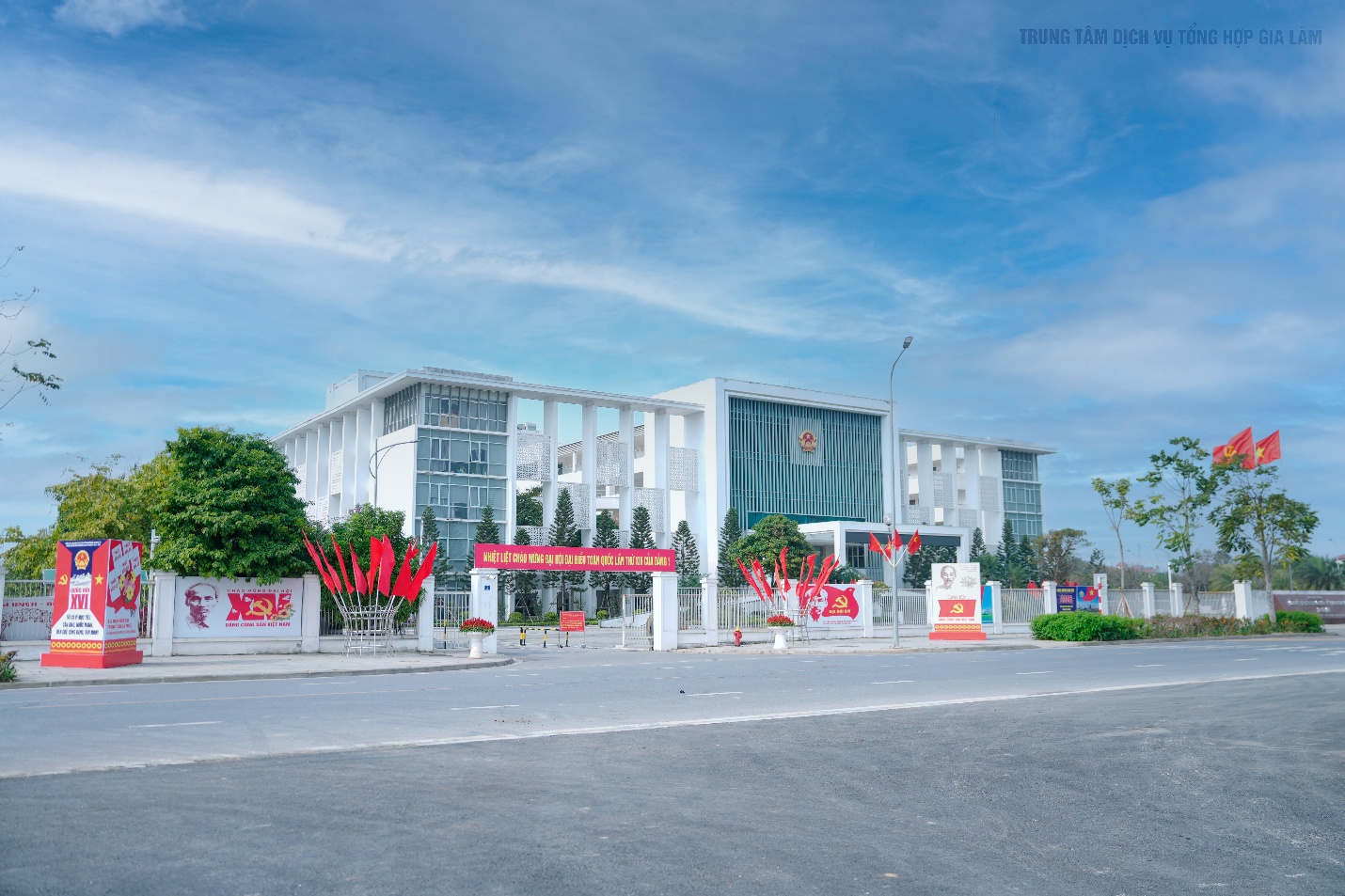 Không khí rực rỡ cờ hoa, pano khẩu hiệu tại trụ sở Đảng ủy-HĐND-UBND xã Gia Lâm chào mừng Đại hội đại biểu toàn quốc lần thứ XIV của Đảng.