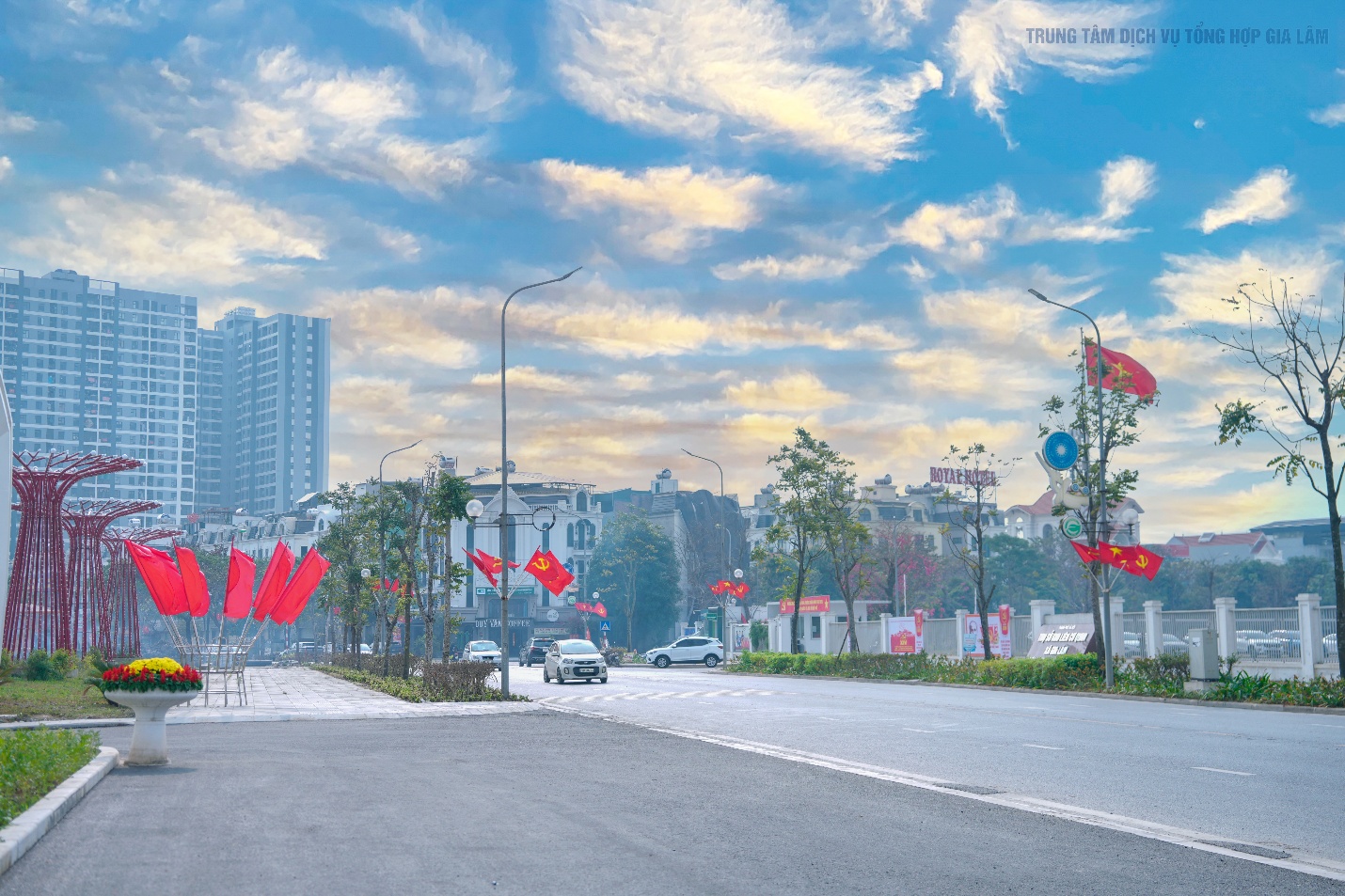 Cờ hoa rực rỡ tạo điểm nhấn trang trọng tại khu vực trụ sở xã Gia Lâm.